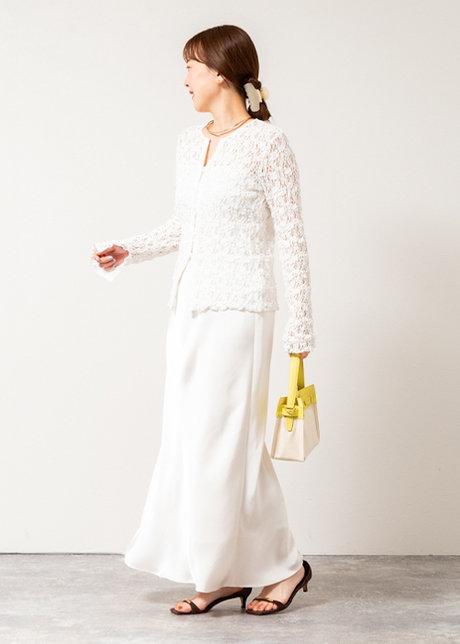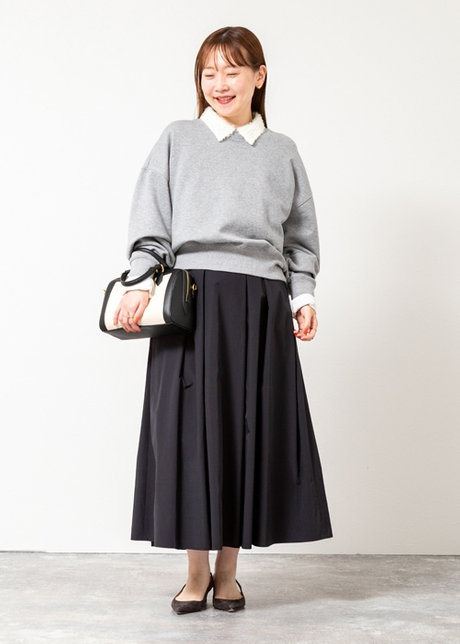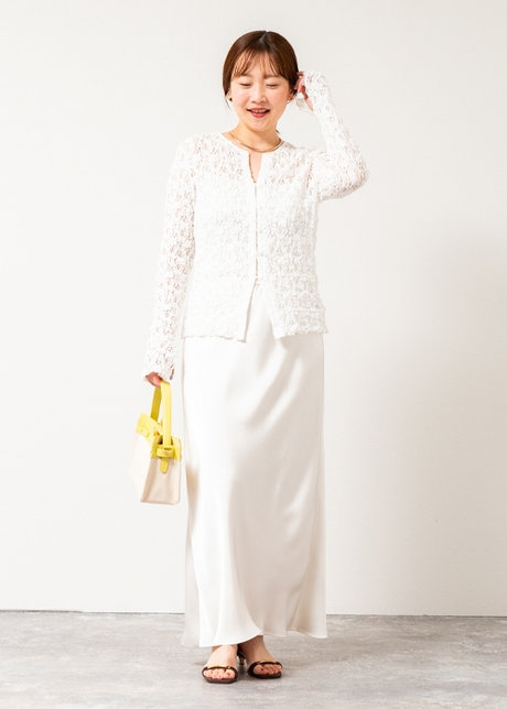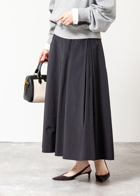 ツヤ素材のスカートで立体感と奥行きを。